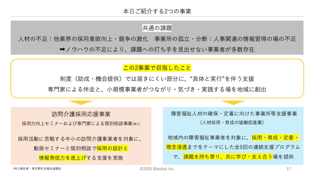 そこでBlanketは、さまざまな自治体と連携し、現場の声を反映した支援プログラムを提供しています。今回は、東京都社会福祉協議会と東京都の委託を受けて実施した「訪問介護採用応援事業」および「障害福祉人材の確保・定着に向けた事業所等支援事業」をご紹介します。