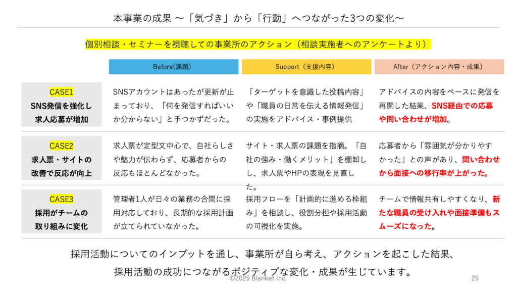 それにより、事業者が積極的に課題解決に向け取り組み、ポジティブな作用が生まれています。例えば、SNSの活用方法を身につけたことで、求人への応募数が増えたほか、公式サイトや求人票の課題を棚卸し、よりわかりやすい内容に精査したことで、面接への移行率が上がりました。