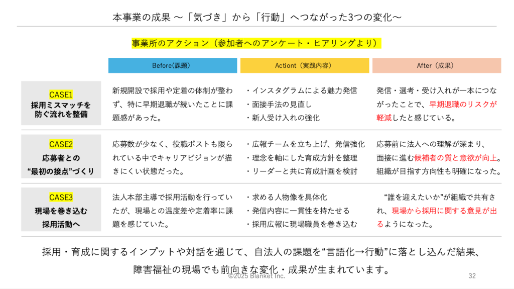 単なるインプットにとどまらず、参加者同士の対話の機会も設けたことで、他事業所の成功例や失敗談を共有し合いながら、各自が“自分たちは何をすべきか”を具体的に考えられる構成としました。