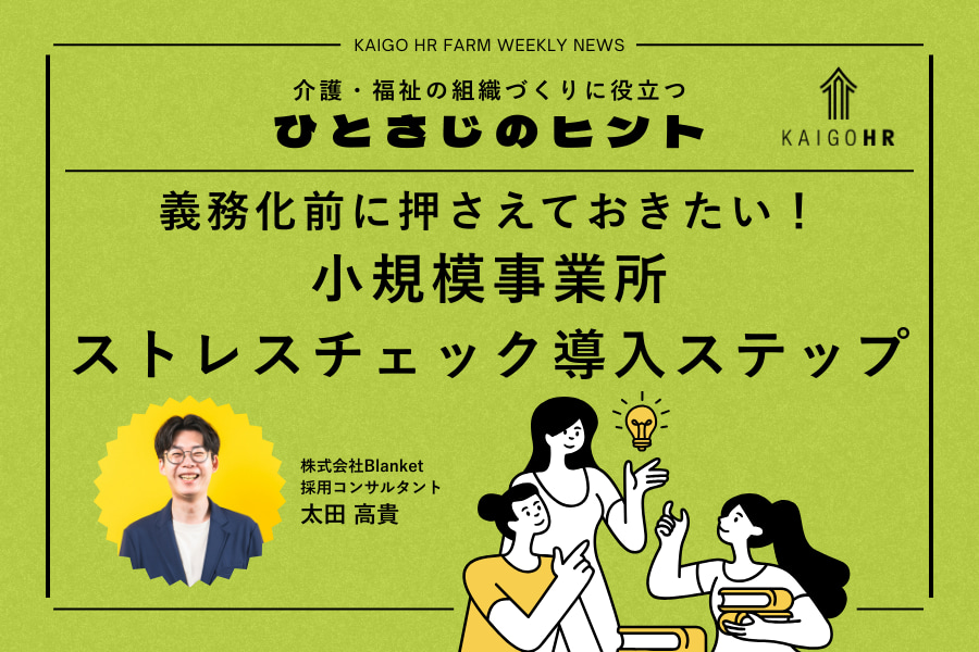 介護・福祉の人事・組織づくりを支援するコンサルタント・太田が、話題のニュースやトレンドから、現場で役立つヒントを読み解く連載コラム。今回の“ひとさじ”は、厚労省が発表した「小規模事業場向けのストレスチェック実施マニュアル(案)」をもとに、介護・福祉の小規模事業所が今からできる準備のポイントをまとめました。