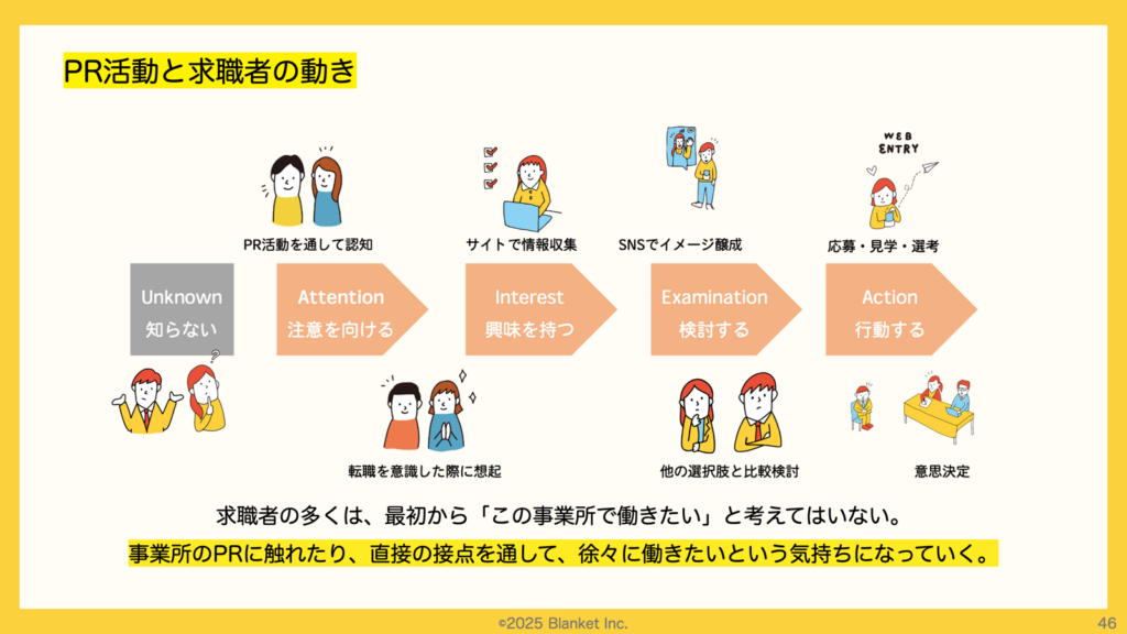 本研修では、まず採用PR全体を俯瞰し、基本的視点を解説、求職者がどのようなプロセスで事業所を知り、興味を持ち、応募を検討するのかを整理します。