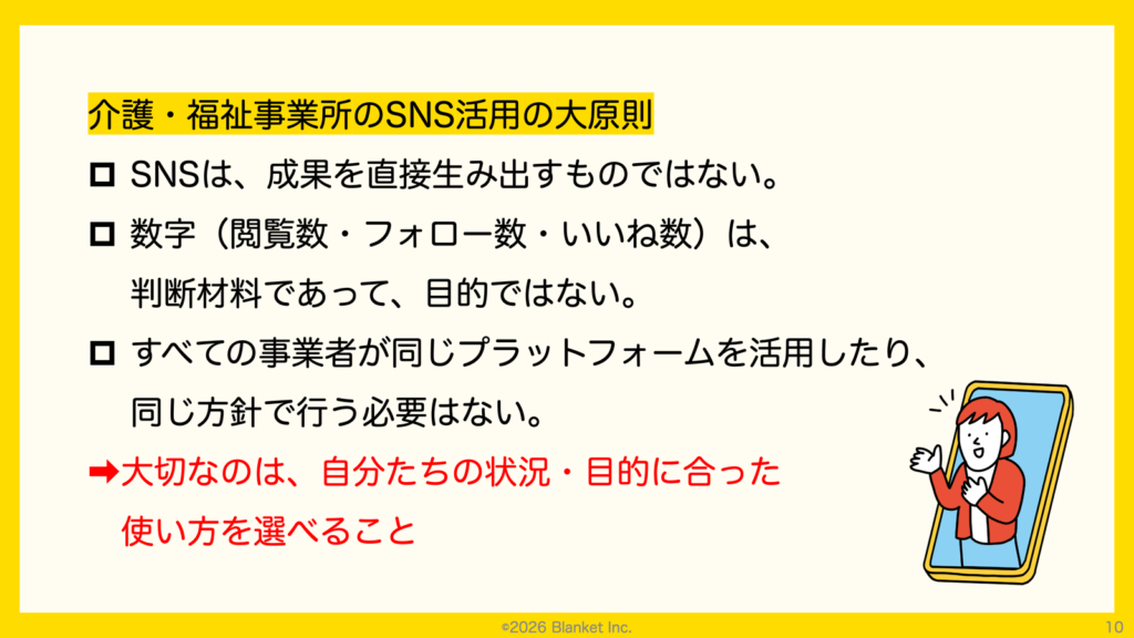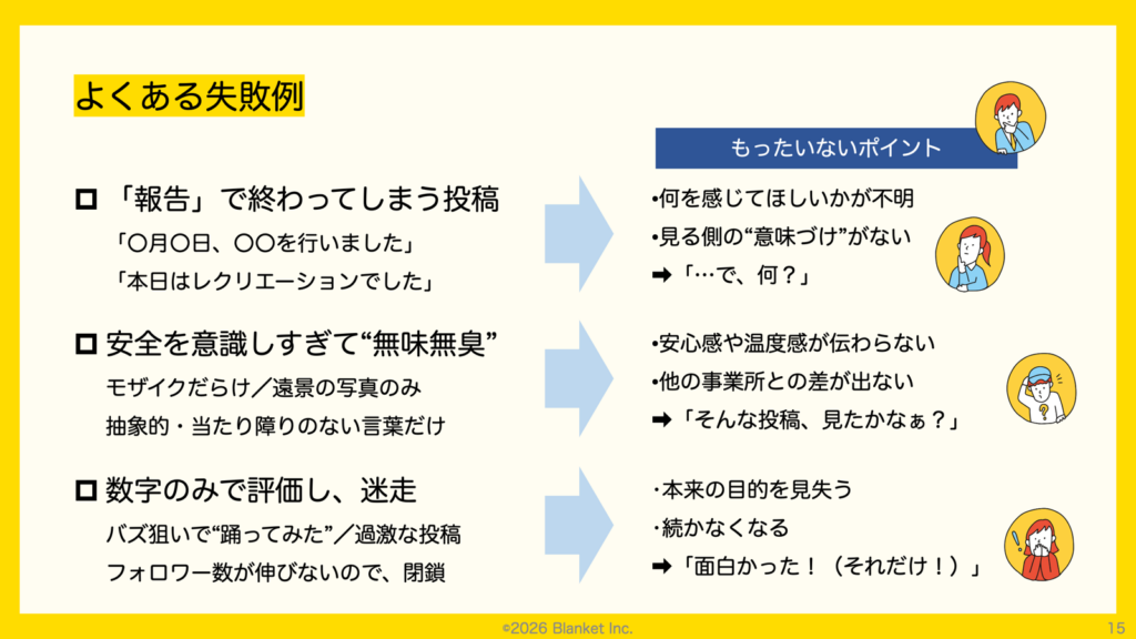 あわせて、よくある失敗例やトラブル事例にも触れながら、数字に振り回されず、安心感や事業所らしさが伝わる情報発信を継続するための考え方を共有します。