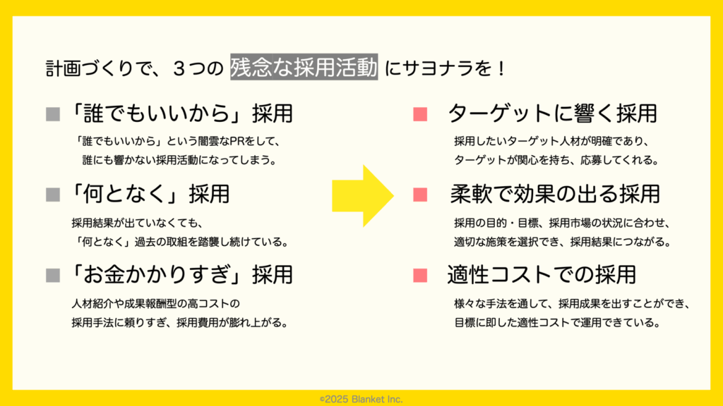 応募が集まらないことから、「誰でもいいから!」と闇雲な採用活動を続けても、なかなか「ここで働きたい」と思ってもらえず、かえって採用力を下げてしまい、結果的に高コストな「お金かかりすぎ採用」になってしまうことも…。