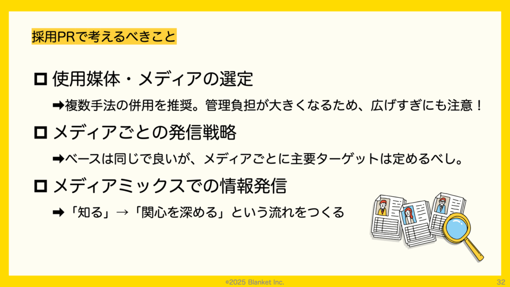 求人票の書き方、求人広告、サイトの制作、SNSの活用、説明会・見学会の実施…。採用活動では様々なアクションがありますが、闇雲に施策を検討してもうまくいきません。ターゲット設定や自組織の強みの言語化、PR方針設定など、採用成功に必要な戦略設計を学びます。
