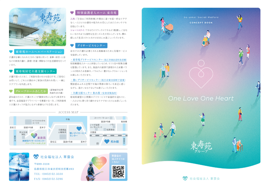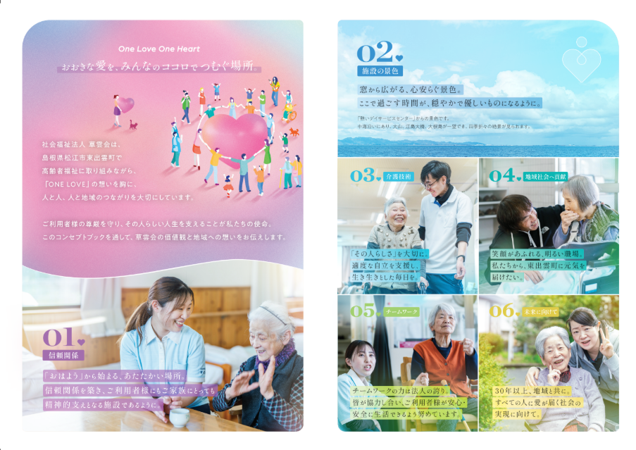 “One Love One Heart ― あたたかな愛を、みんなのココロでつむぐ場所。”パンフレット:社会福祉法人草雲会様